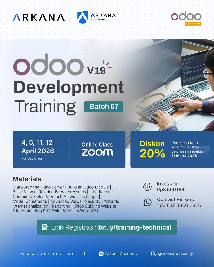 Training Development akan berfokus pada pengembangan Odoo serta memahami pengetahuan untuk menyesuaikan dan mengembangkan ide baru ke dalam platform ERP Odoo.