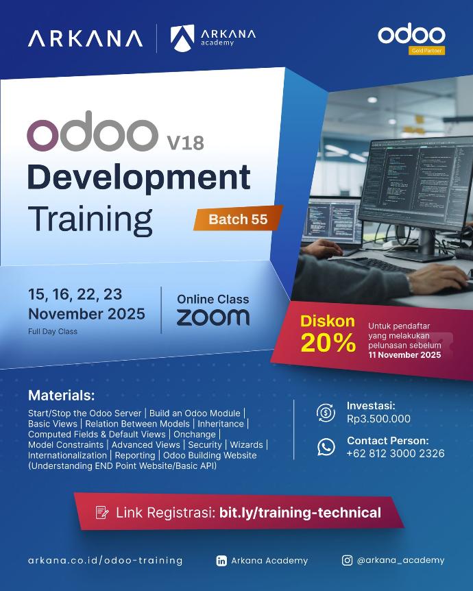 Training Development akan berfokus pada pengembangan Odoo serta memahami pengetahuan untuk menyesuaikan dan mengembangkan ide baru ke dalam platform ERP Odoo.